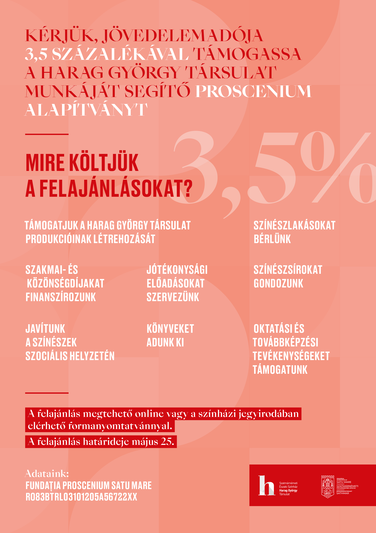 Kérjük, idén a felajánlható 3,5 százalékkal támogassa a Harag György Társulat munkáját segítő Proscenium Alapítványt, vagy a Brighella Bábtagozatot segítő Art Project Egyesületet!